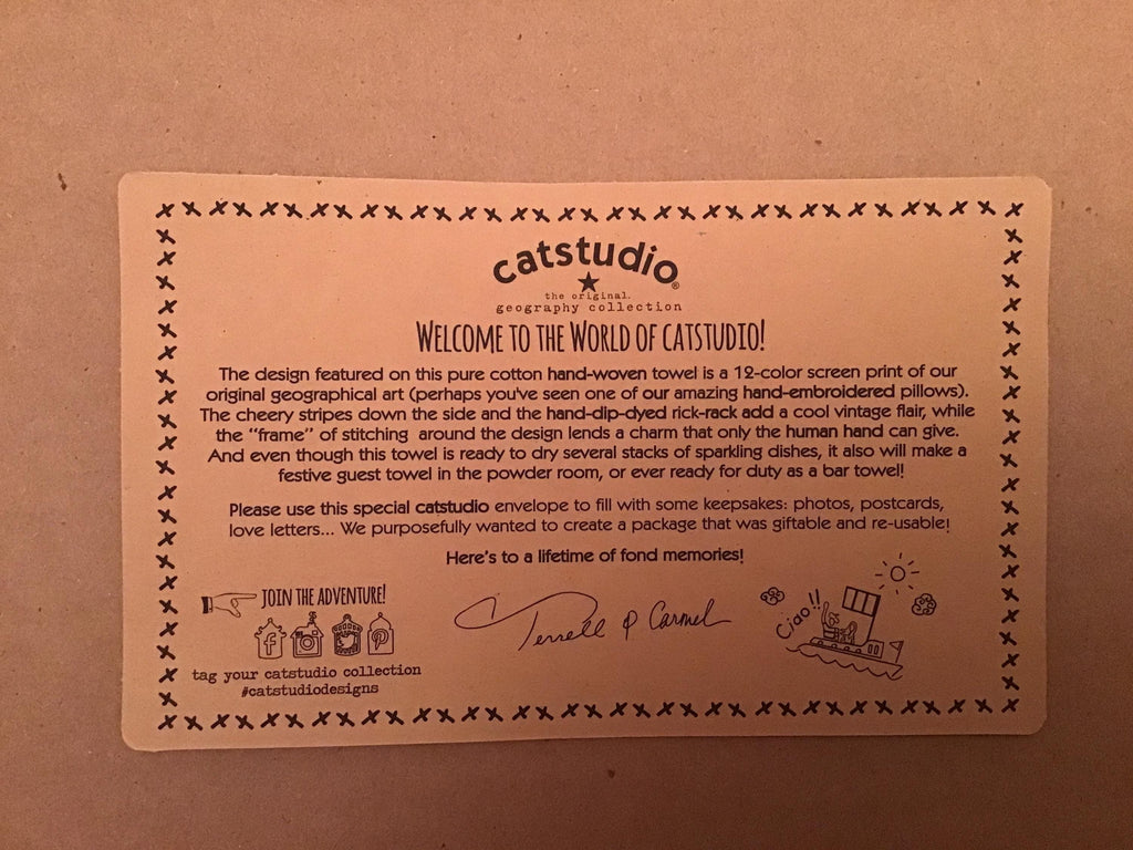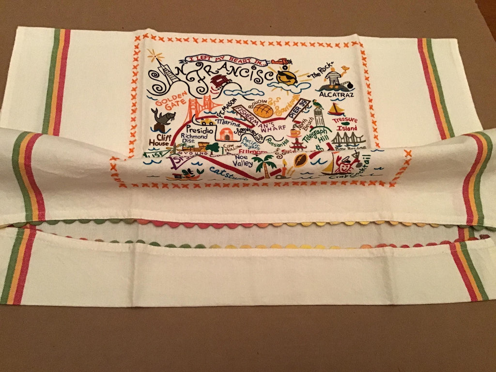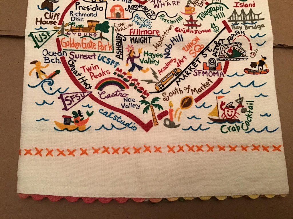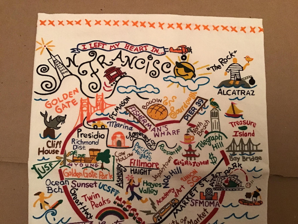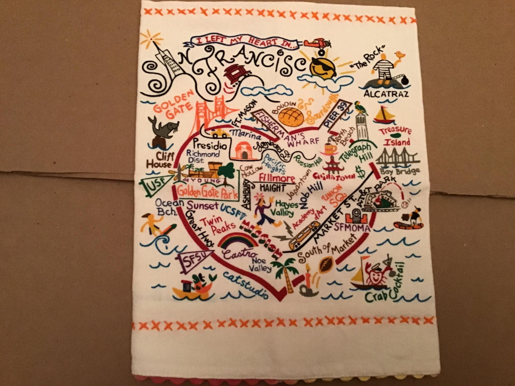 Bright and cheerful towel from Catstudio featuring the wonderful city of San Francisco! Screen printed designs in bold colors bring out the best of the city on the bay. Perfect for using or just viewing, this makes a great gift. To a special someone, or your special self! 100% cotton.