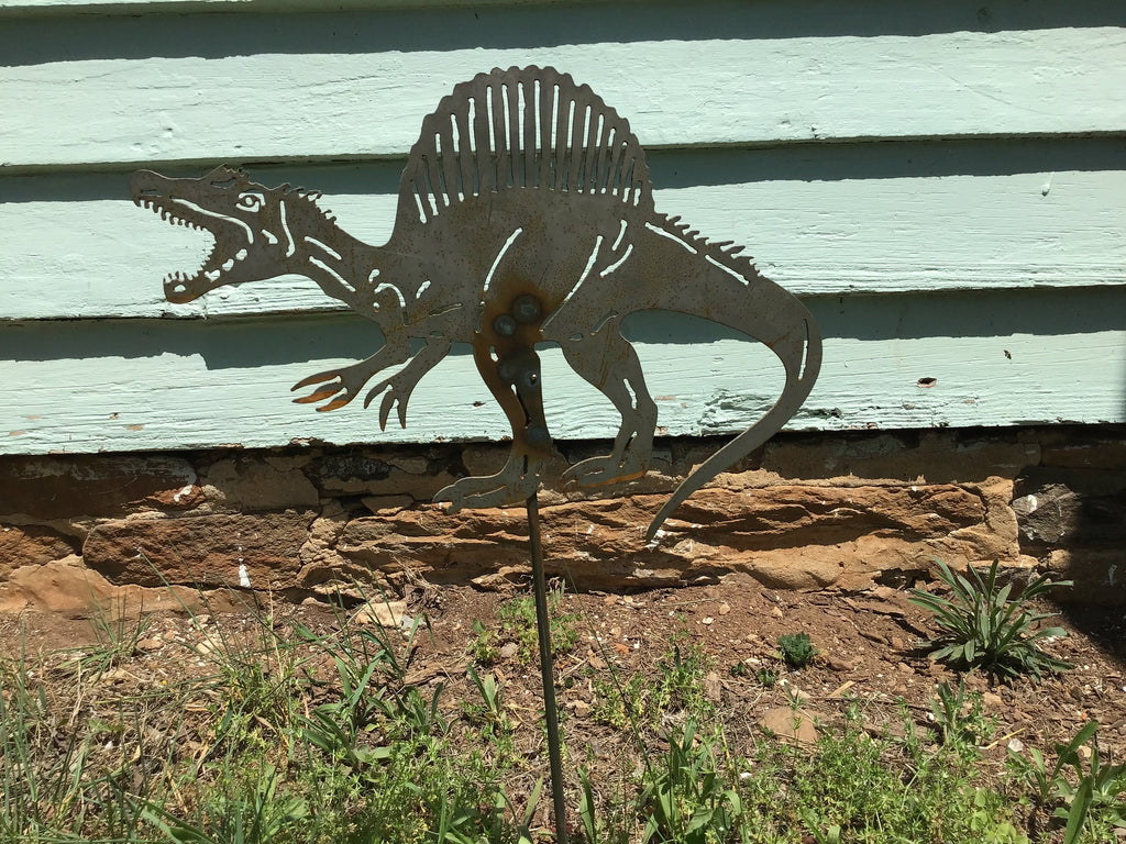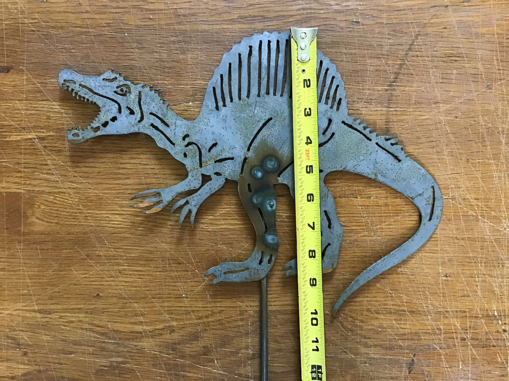 Designed & Fabricated in our shop out of sturdy 16 gage metal, this Spinosaurus Dinosaur Garden Stake is ready to guard your yard!