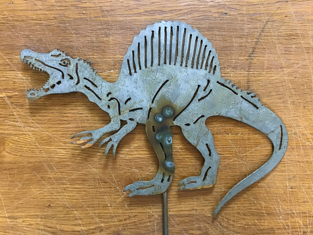 After we cut the dinosaur out, it is lightly sanded, then a 1/4” steel rod is welded on for easy display.