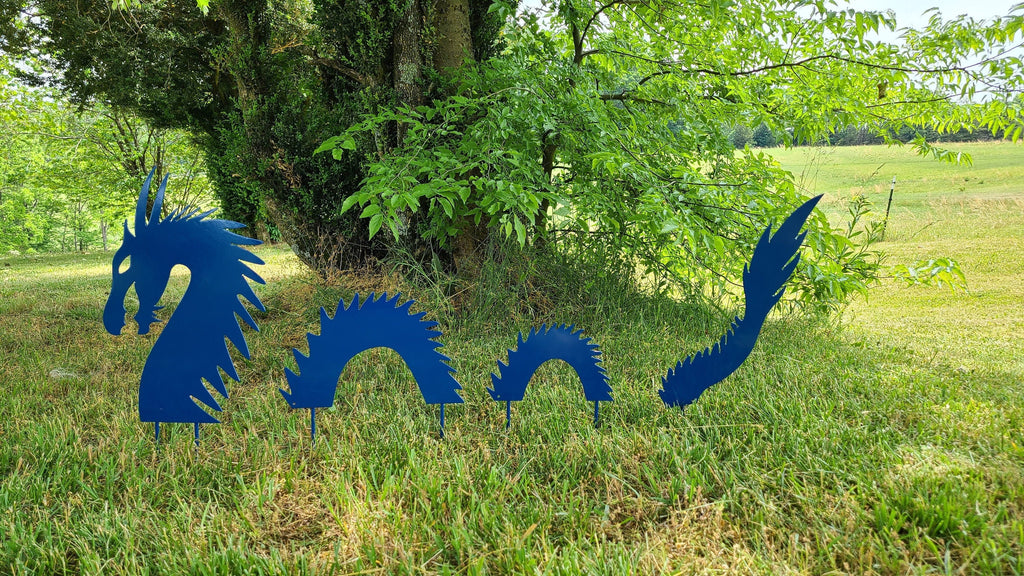 Large Dragon Metal Art Garden Stakes are a 4 piece set that will add a fierce touch to any yard or garden!