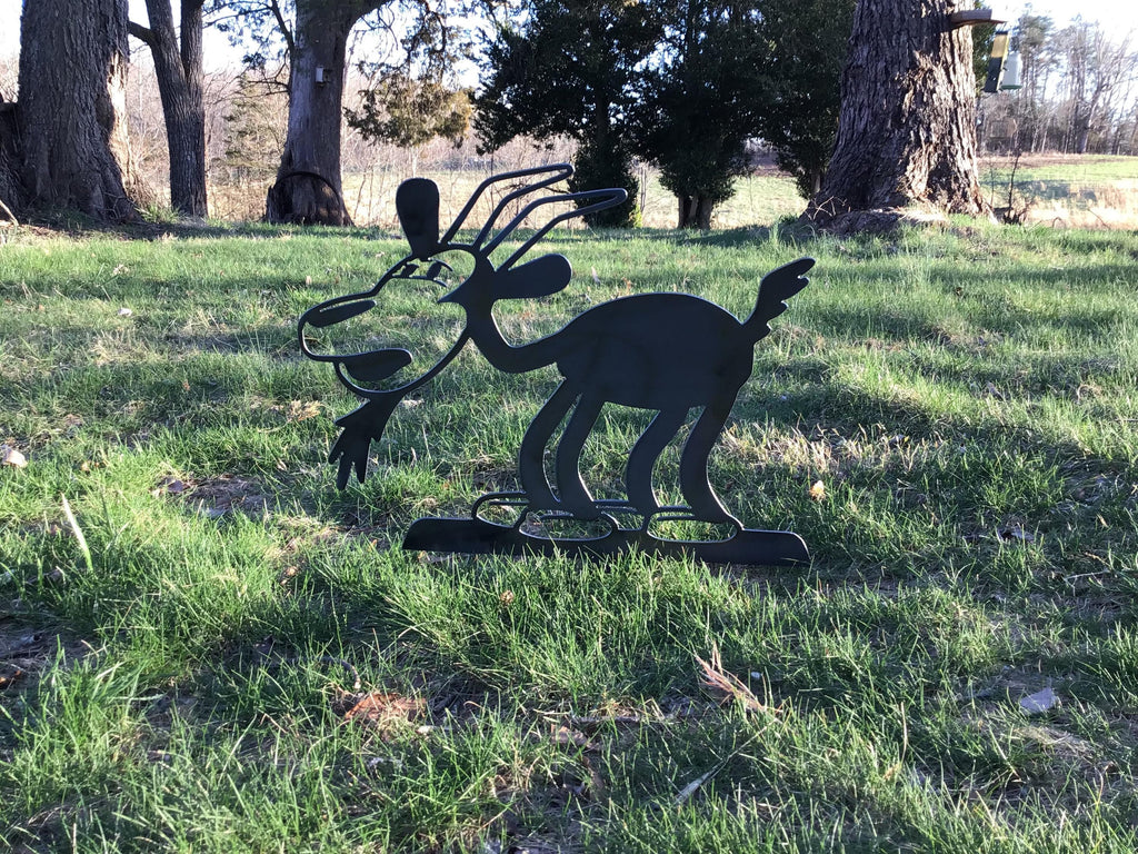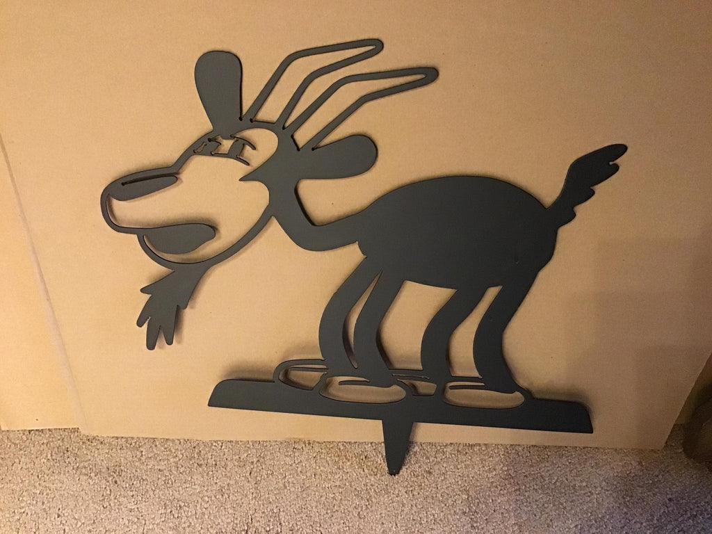 Great Goat Garden Stake from Disney’s 1928 Steamboat Willie Cartoon. This metal yard art is cut out of 16 gauge metal, and comes in two finishes. Natural Metal (which will rust over time) and Black Powder Coat, for a rust resistant finish.