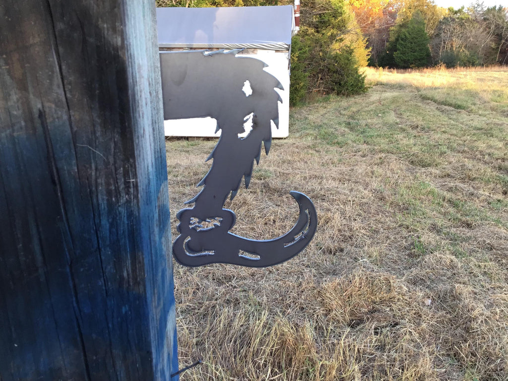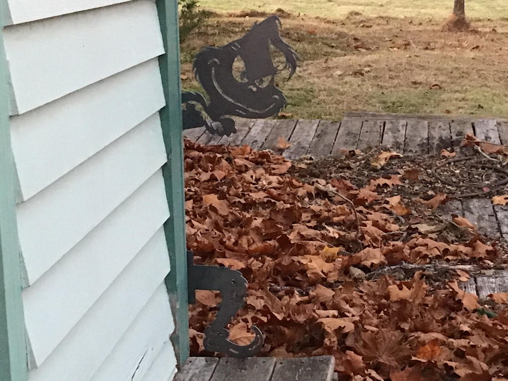 2 piece Grinch (head and foot) are cut out of 16 gauge metal, and ready to be displayed with pre-drilled holes in each flange. They can be purchased in bare metal, which will have some rust, and will rust more over time. You can add your own touch with paint and a Santa hat! They can also be powder coated Grinch Green or Flat Black.
