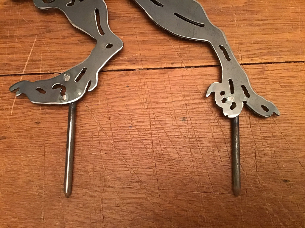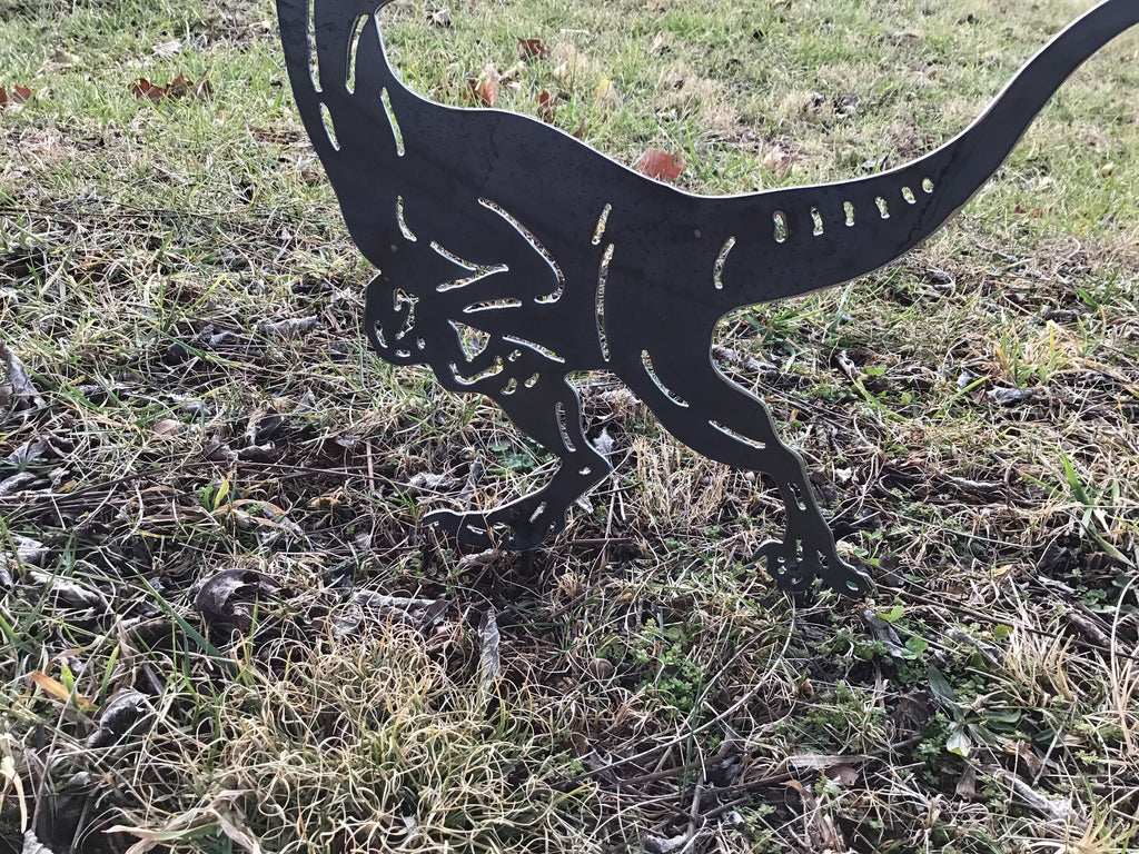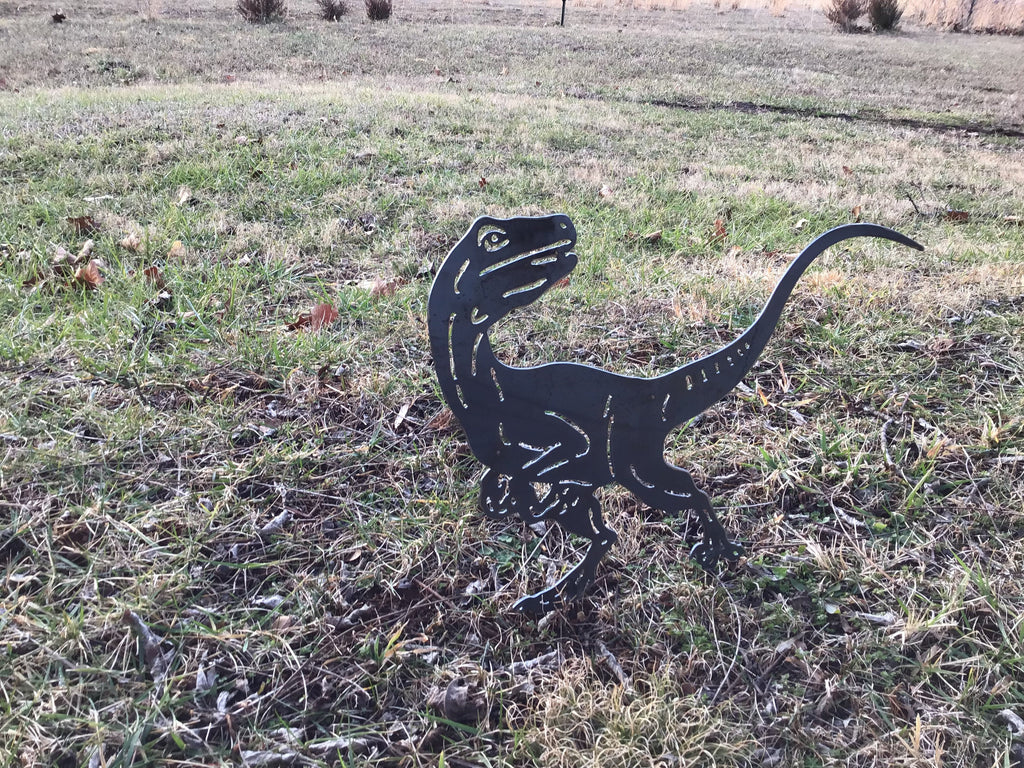 Turn your yard into Jurassic Park. This version of our popular Velociraptor is welded onto two short pencil rods so it appears it is walking on the ground.