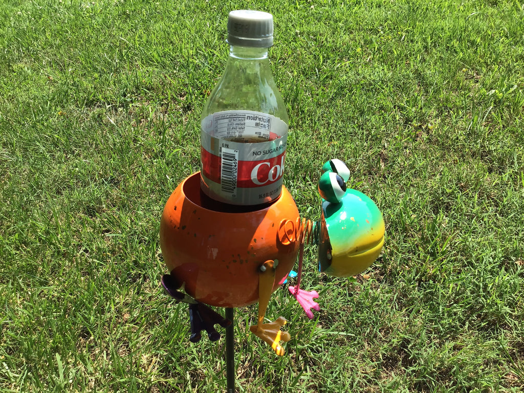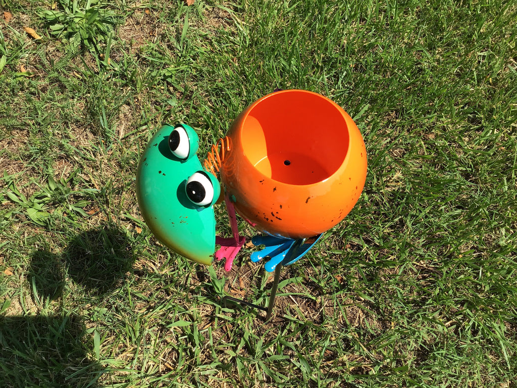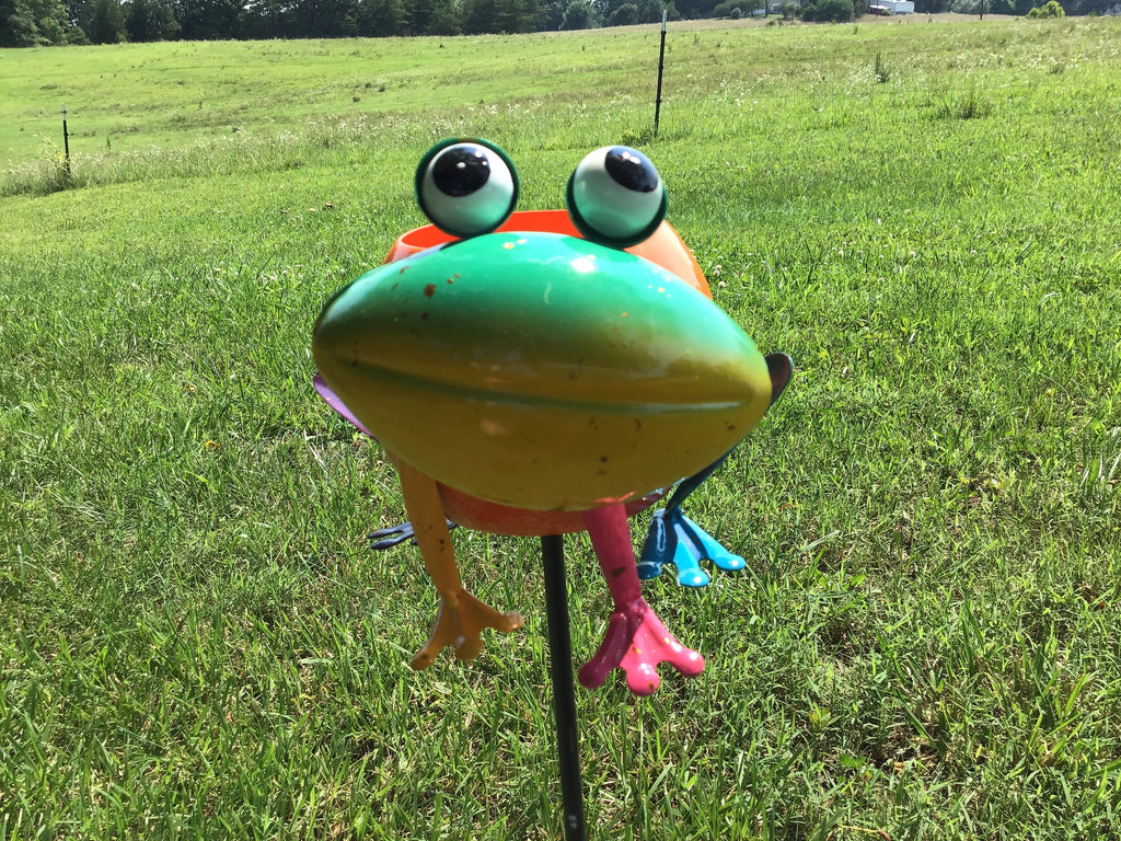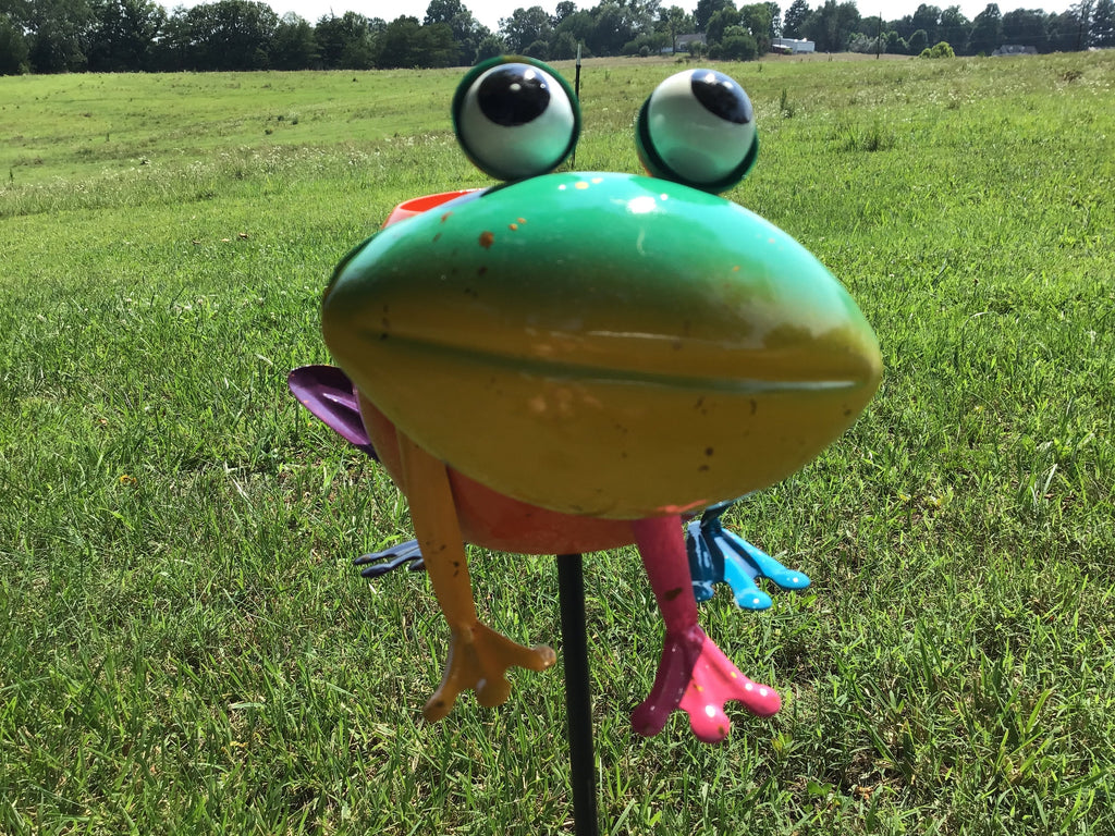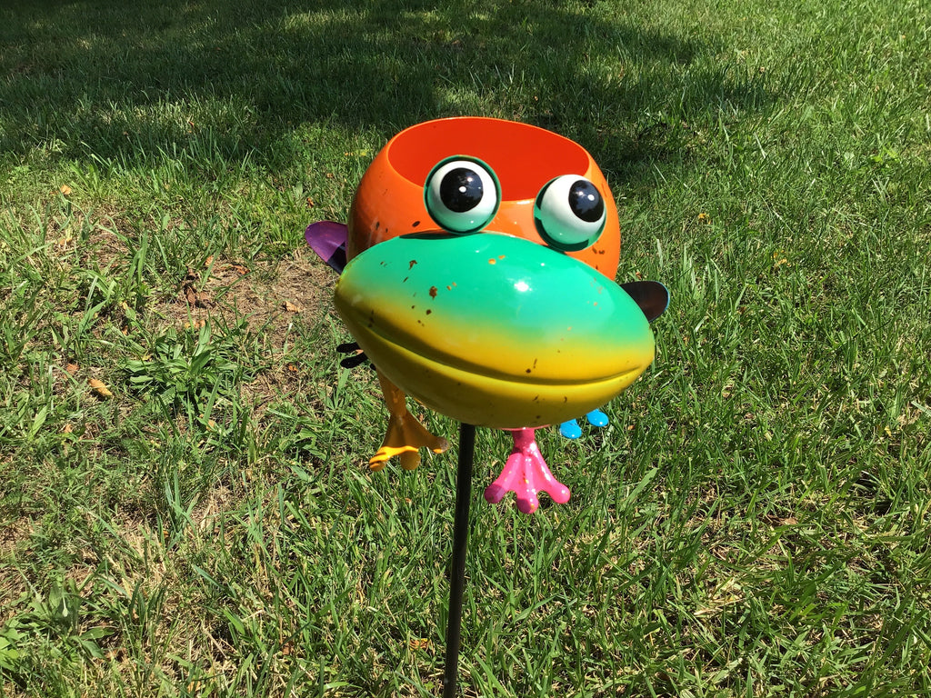 A happy frog to brighten up any yard, porch, or shelf! Can even be set on the included garden stake by a lounge chair to be used as a beverage holder.